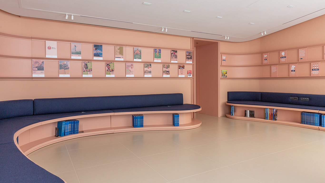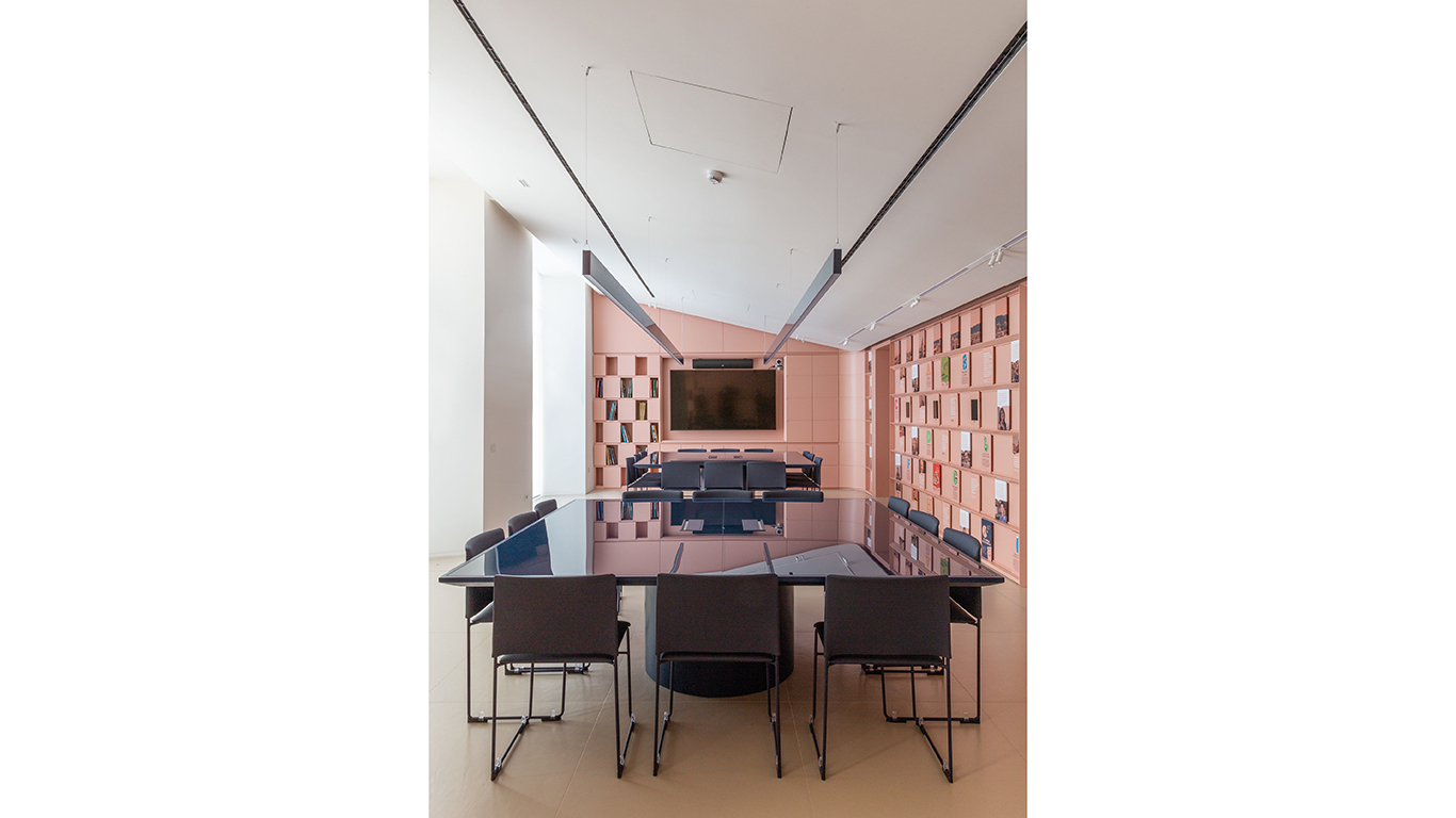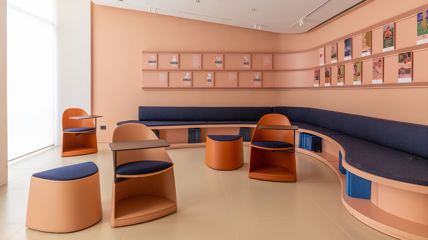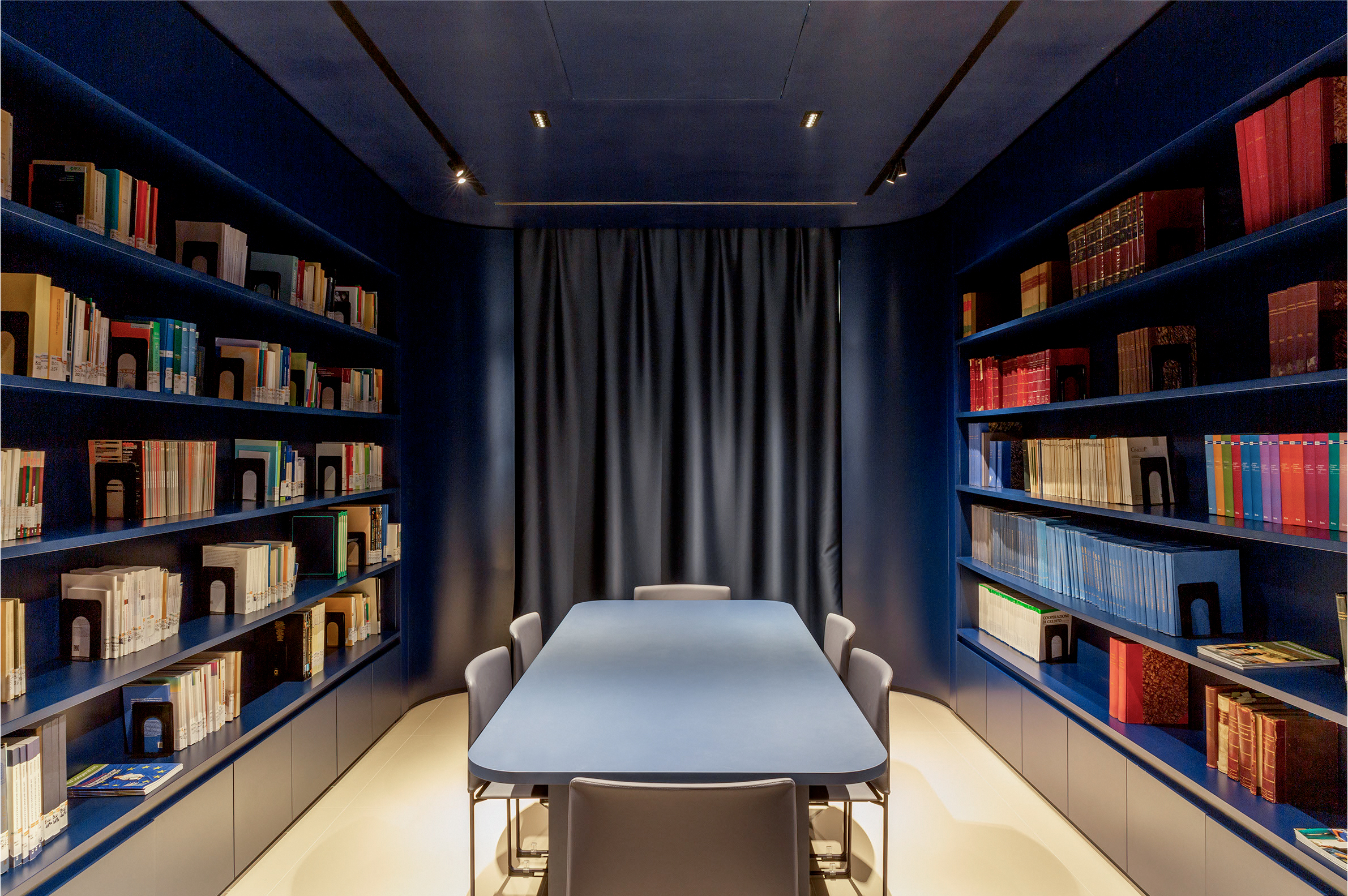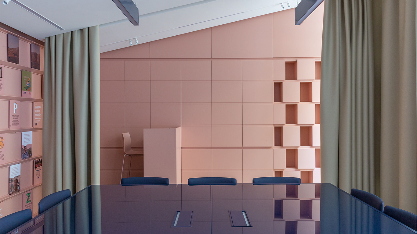 La sala, lo spazio nevralgico del progetto, è un luogo concepito per il lavoro di squadra e arricchimento reciproco, anche attraverso l’attenzione ai dettagli e di arredo, disegnati su misura dal team di progettisti: la cromia calda color mattone abbraccia tutte le pareti attrezzate, che diventano un dispositivo di racconto dell’azienda; una grande tenda isola acusticamente l’ingresso dal resto della sala, così da creare uno spazio isolato. In diretta continuità, la biblioteca, che vira su toni di blu profondo delle pareti e le scaffalature, creando un luogo raccolto e silenzioso per studi approfonditi. Mantiene lo stesso concept l’ala dedicata alla formazione, dove una seduta continua e sinuosa in tessuto color cobalto si snoda lungo tutta la parete, mentre alcuni arredi mobili per appoggio individuale, punteggiano la sala, permettendo infinite configurazioni a secondo delle esigenze.