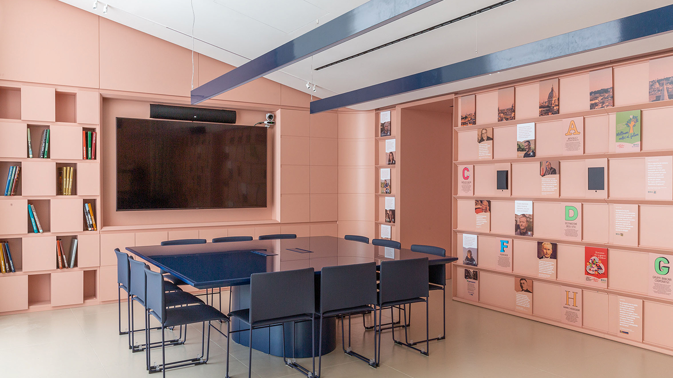 Uno nuovo spazio di condivisione, studio e confronto per i dipendenti: questa la richiesta da parte del cliente, la Banca di Credito Cooperativo e Federcasse di Roma, per la propria sede di Roma. L’intervento a cura di Diele Kerciku Architetture con Raimondo Jereb e Donato Labella (Spread Out Studio) è composto da due ambienti, destinati uno alla sala grande del CDA con la biblioteca, l’altro alla formazione.