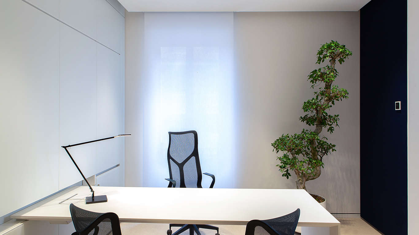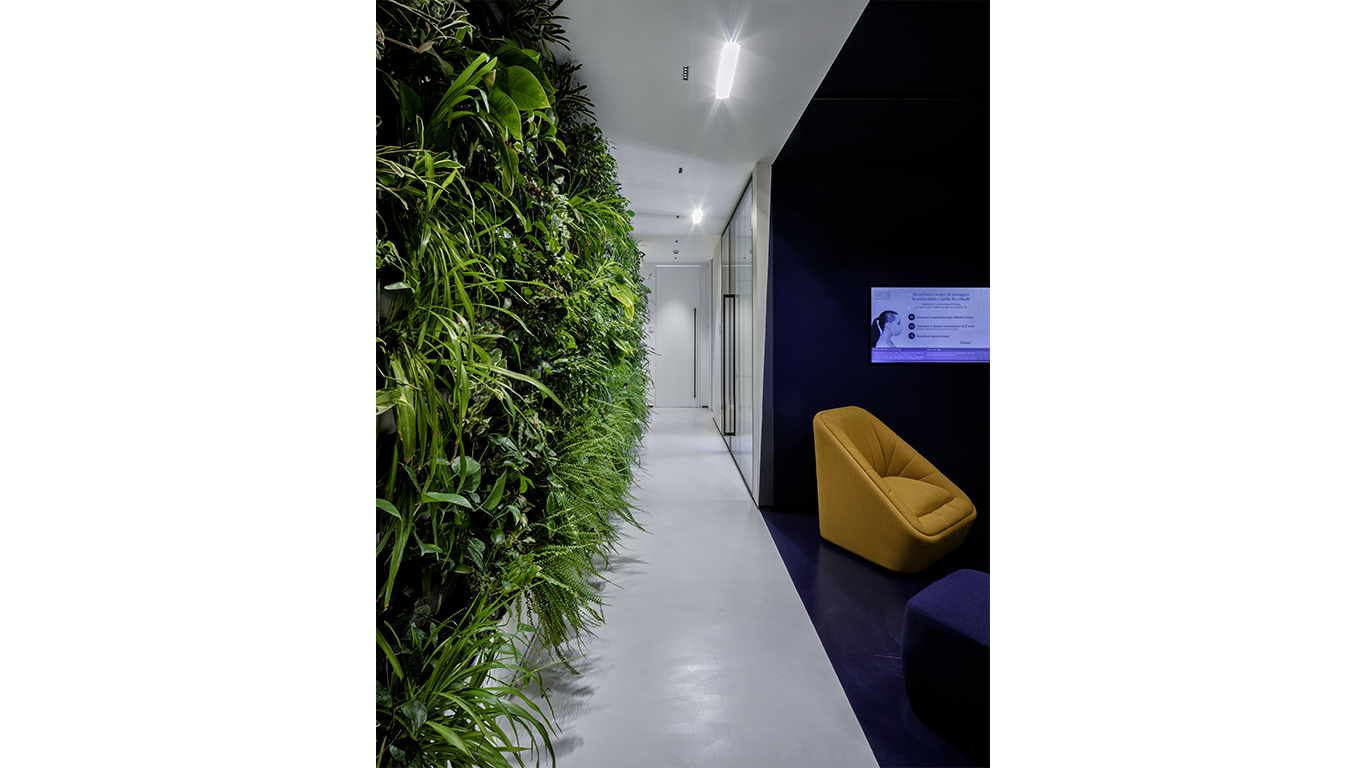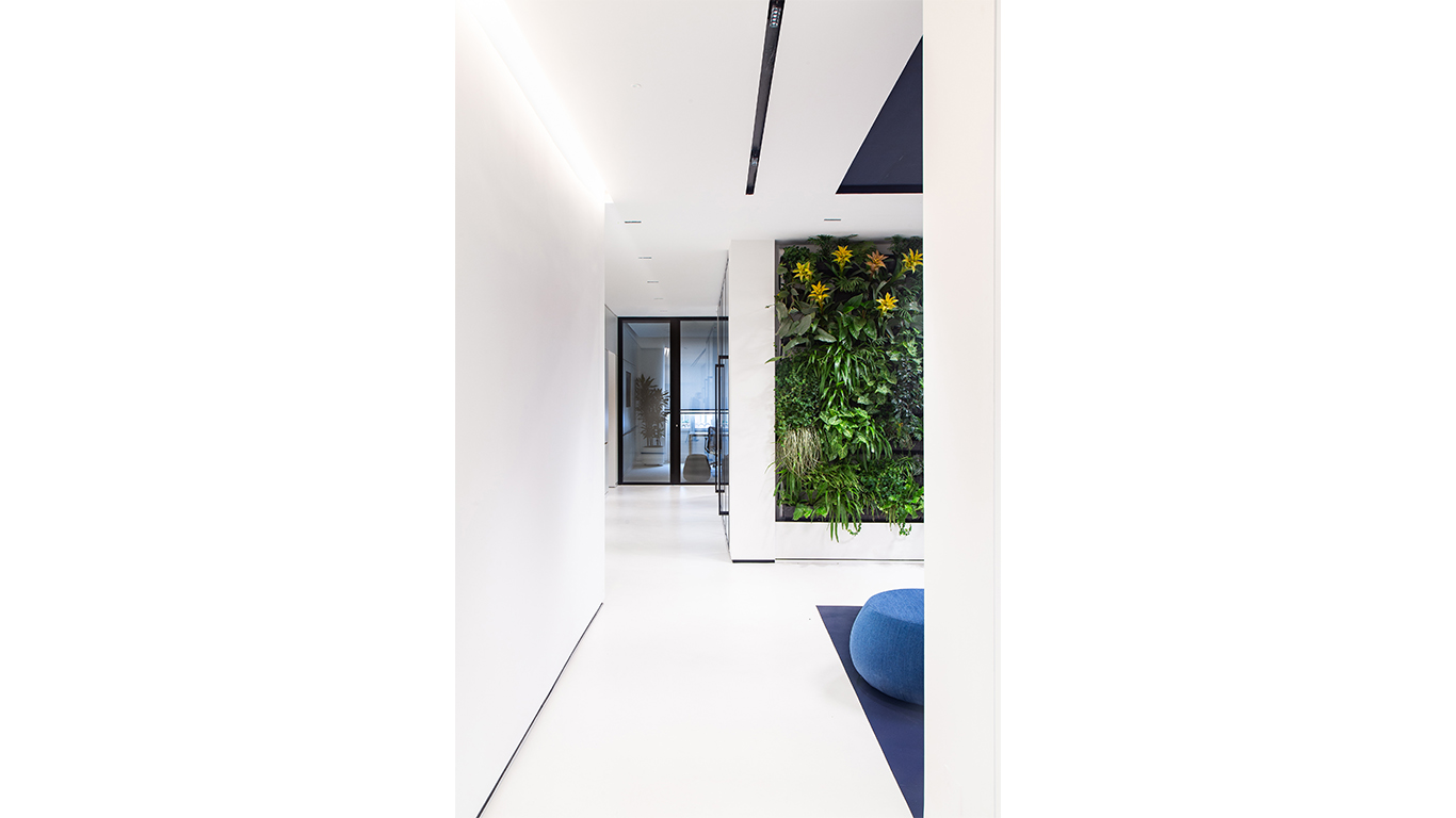 Il nero delle cornici di pareti e porte vetrate e dei corpi illuminanti, in forte contrasto con il bianco delle pareti e dei soffitti, inoltre, richiama le tessere bianche e nere dei mosaici di epoca romana. Anche il ricorso alla vegetazione di progetto è un richiamo a Roma e ai suoi parchi e attraverso il design studiato, mai casuale, diventa filo conduttore dell’esperienza dello spazio. Il colore blu, colore del brand, infine, connota gli spazi principali e quelli relax. La sede occupa il quarto e il quinto piano dello storico Palazzo Valadier (affacciato su Piazza del Popolo e sui giardini del Pincio), realizzato dall’architetto Giuseppe Valadier nella prima metà del 1800 e vincolato presso la Soprintendenza Speciale Archeologica Belle Arti e Paesaggio di Roma. Lo spazio interno, anch’esso vincolato, si estende su circa 1200 mq ed era originariamente composto da una serie di piccoli ambienti collegati da corridoi con poca luce naturale e di scarsa qualità architettonica. Le sale break e lounge ricorrono in diverse parti dell’ufficio in modo da stimolare e rendere sempre disponibili le occasioni di confronto, collaborazione e socialità tra i consulenti dell’azienda.