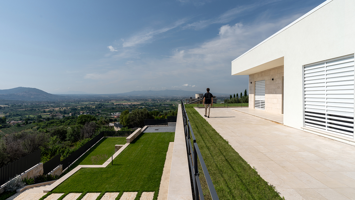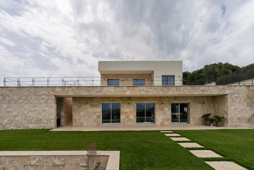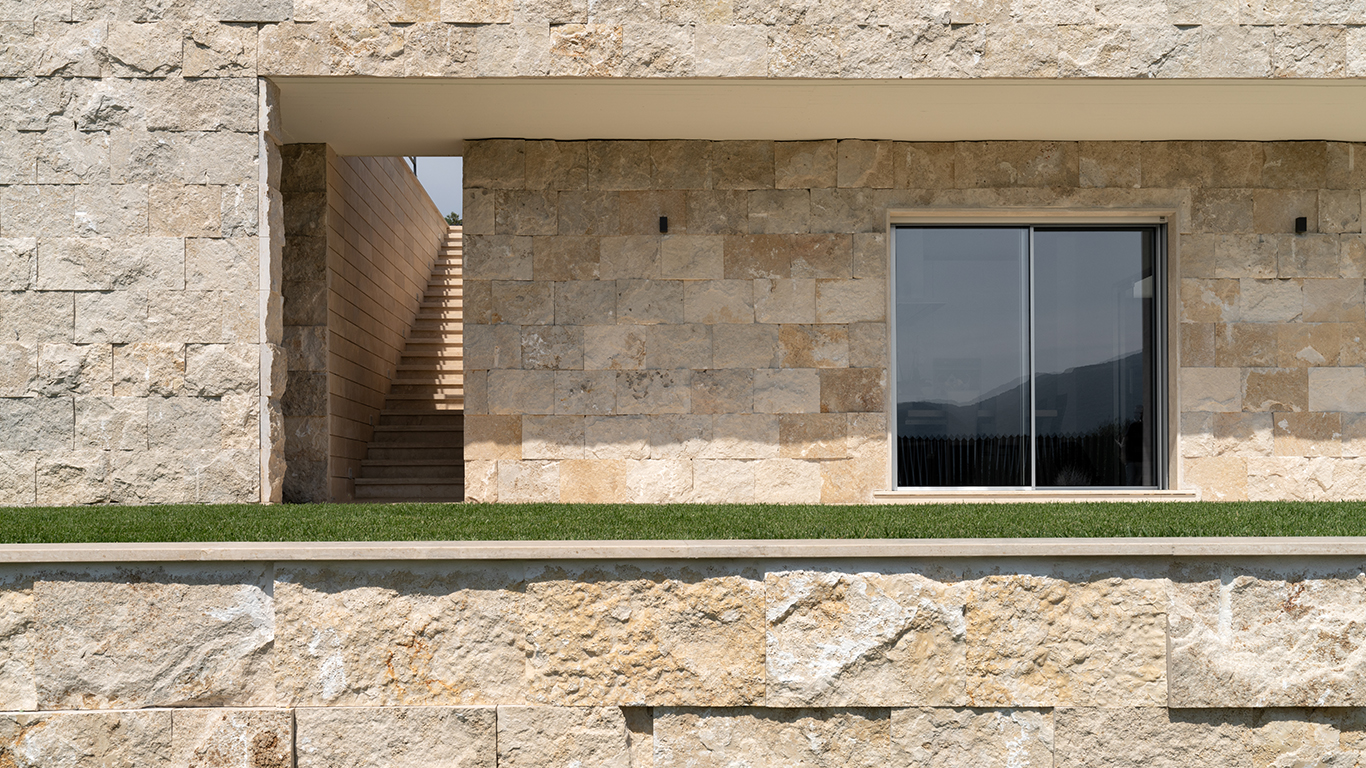 Il concetto di natura portato all’interno della casa è il concept del progetto per Villa Ecrù. Un sistema di patii, esterni ed interni, collega visivamente tutta la lunghezza del salone e della cucina ampliando così lo spazio abitativo. Le ampie vetrate aperte sul panorama completano l’opera architettonica. Le aperture vengono schermate da serramenti in legno, disegnati su misura. Durante l’inverno il corpo centrale della casa diventa una “serra” che accumula calore, distribuito nei diversi ambienti. l’esposizione a SE consente di incamerare luce e calore. Sul lato N, le pareti in pietra e le alberature sempre verdi, poste su una quota più alta schermano il freddo. In estate il fabbricato grazie alle aperture, al pozzo di luce centrale, e al posizionamento strategico dei brise soleil diviene un ambiente rinfrescato. Il vetro in copertura, apribile, è pensato per consentire l’uscita dell’aria calda. Il corridoio di nuoto, localizzato strategicamente a filo del piano seminterrato, permette alla naturale vaporizzazione dell’acqua di rinfrescare, grazie anche alla schermatura delle piante, tutto l’ambiente abitativo.